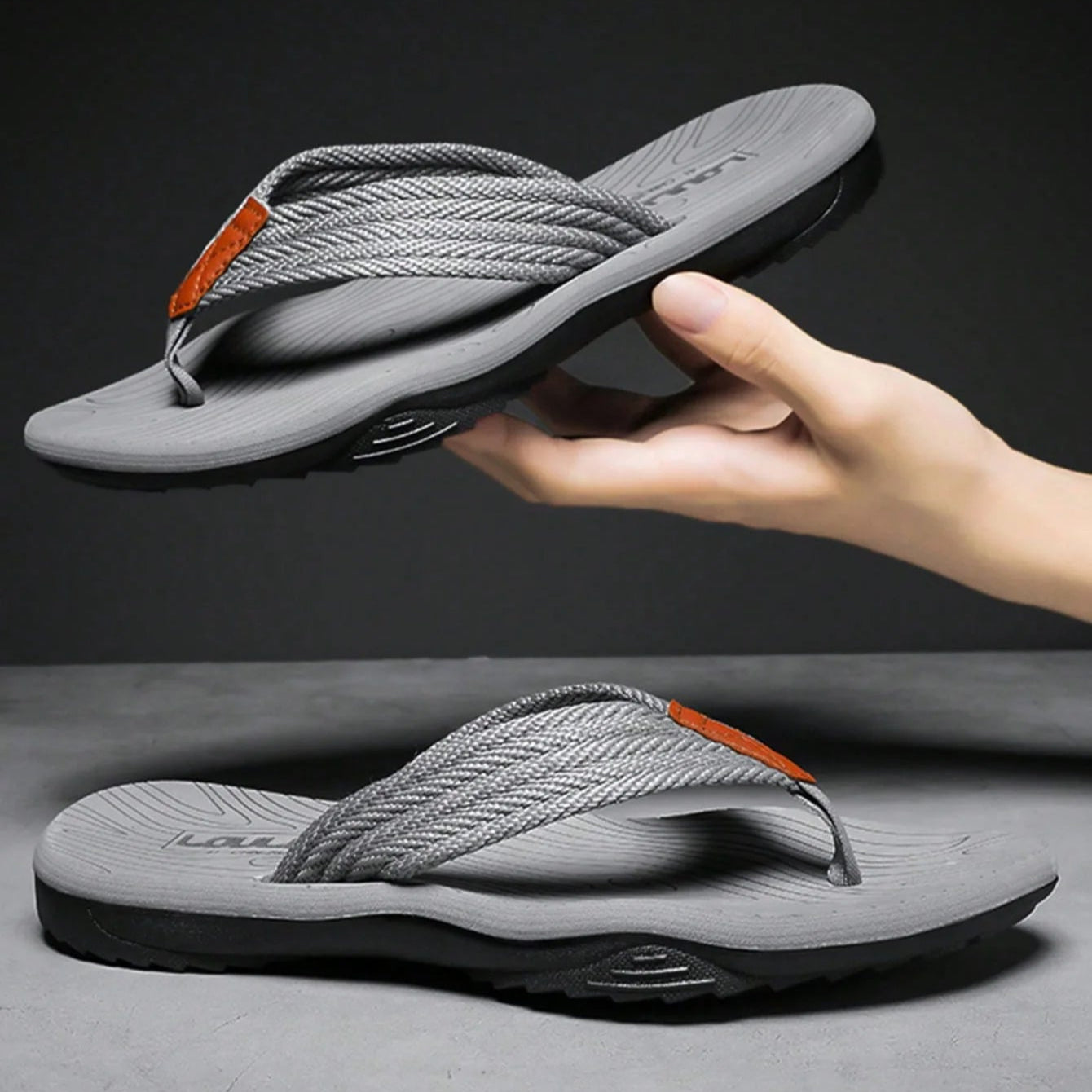 Embrace day-long comfort with these flip-flops that feature a cushioned footbed that moulds to your step, a durable anti-slip sole for everyday grip, and wide woven straps for a secure and easy fit.