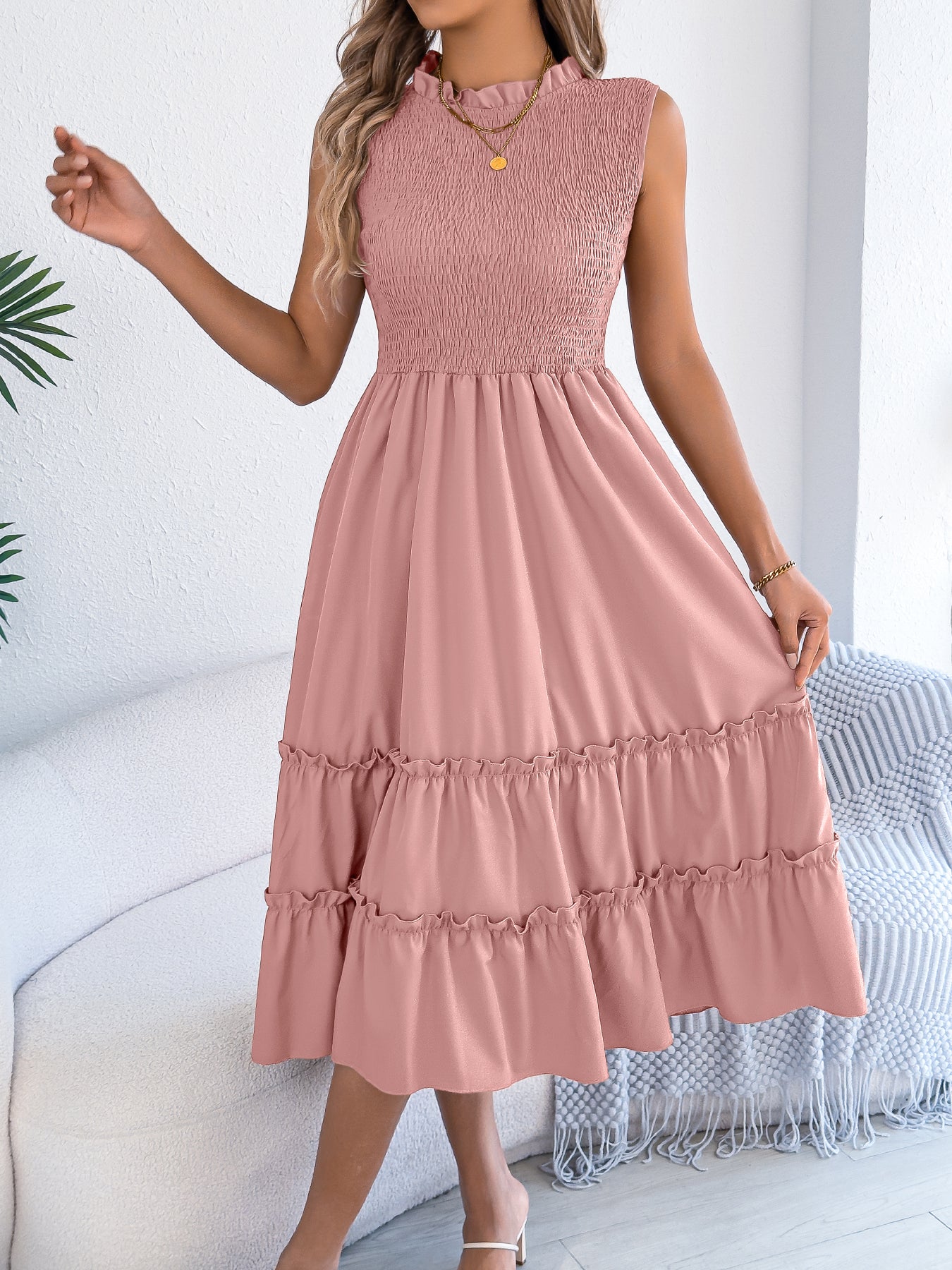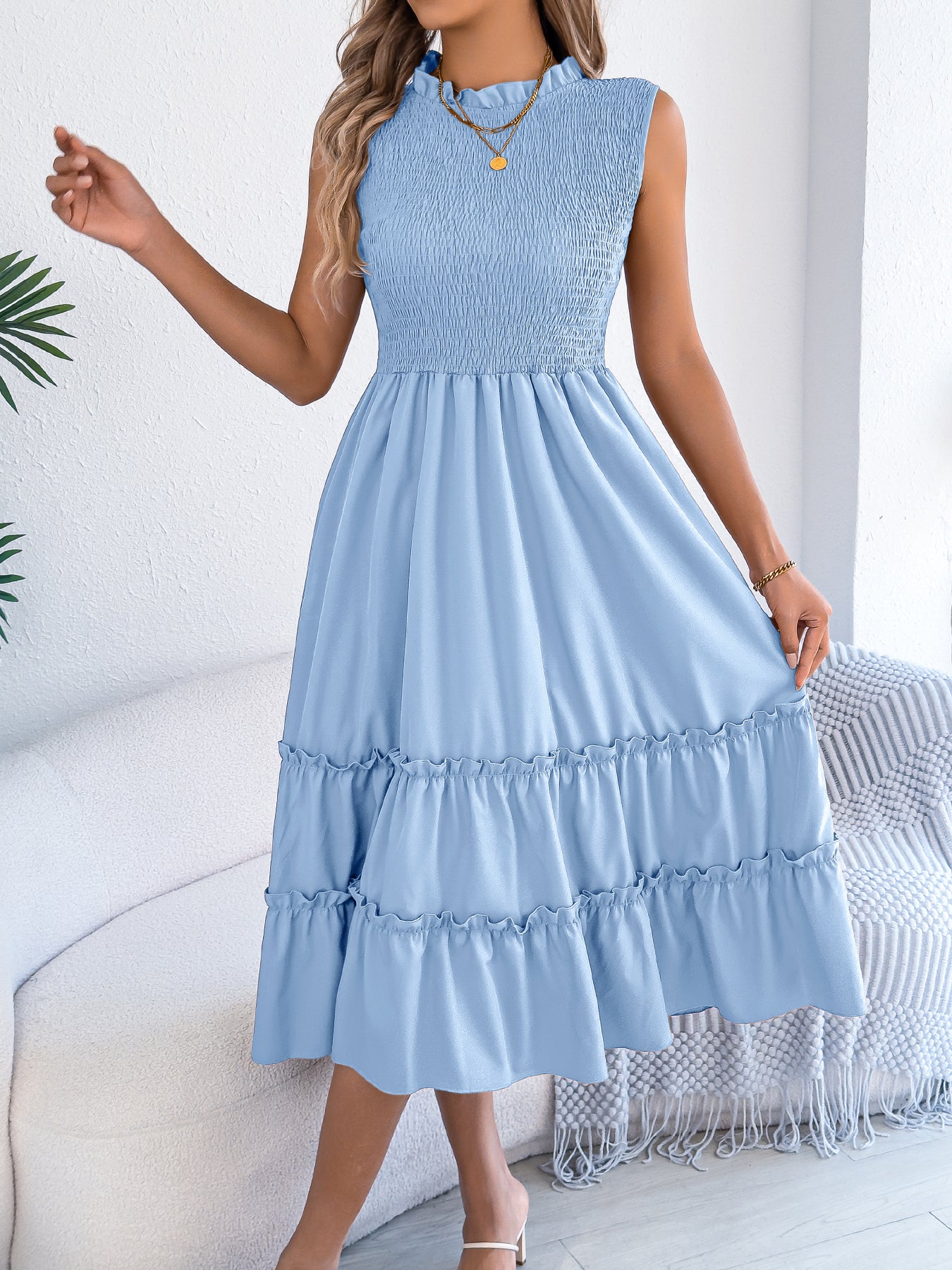 Airy yet grounded, this tiered midi dress delivers effortless grace with a smocked bodice and ruffled skirt. An elevated essential that floats with you from morning to evening.