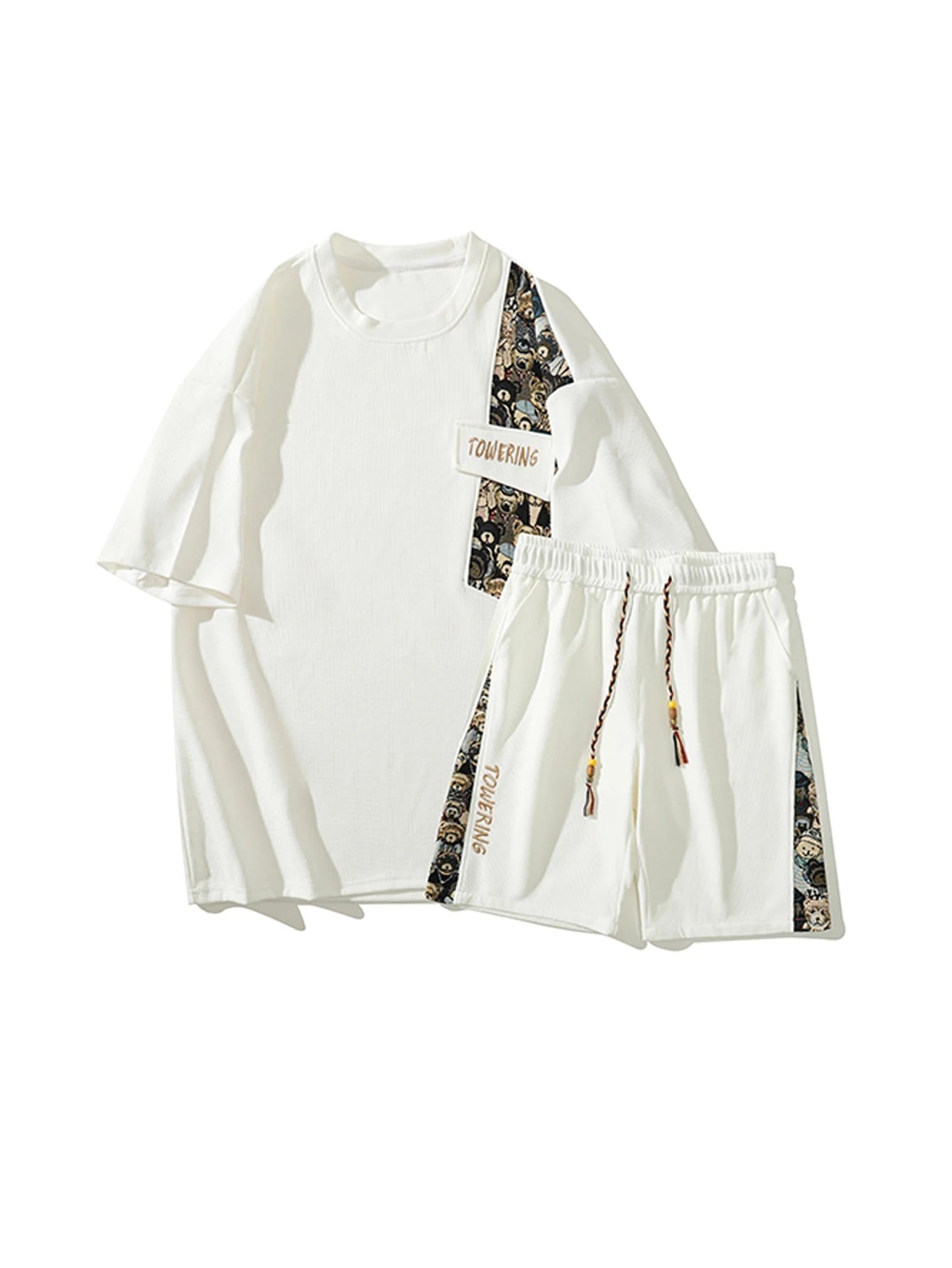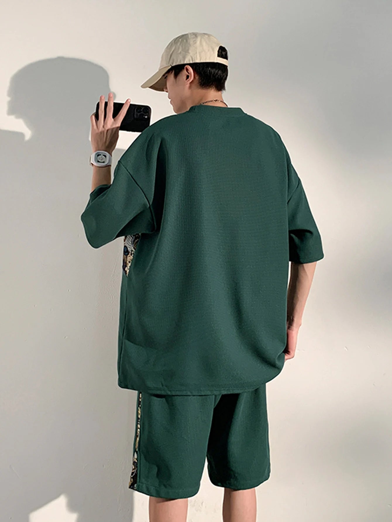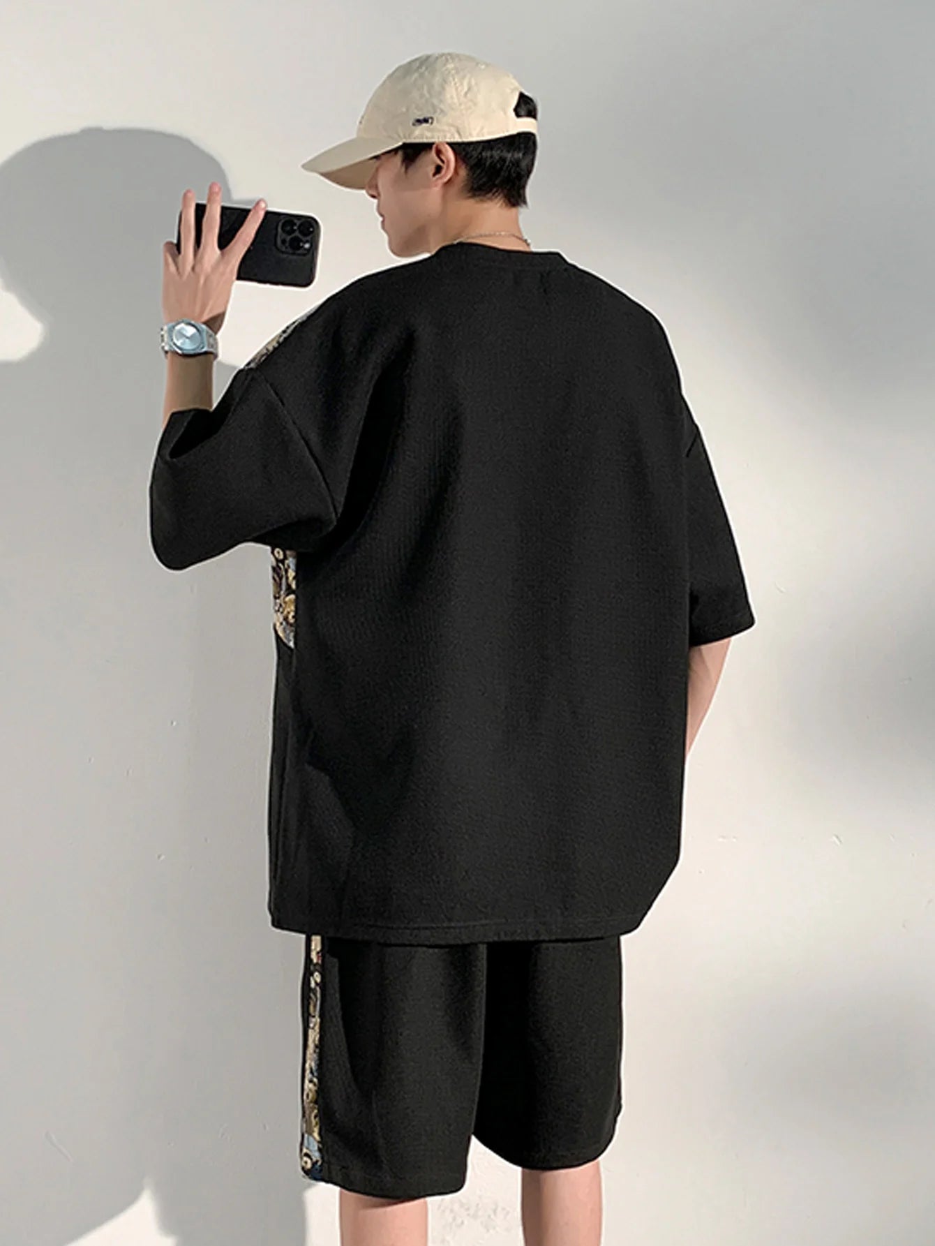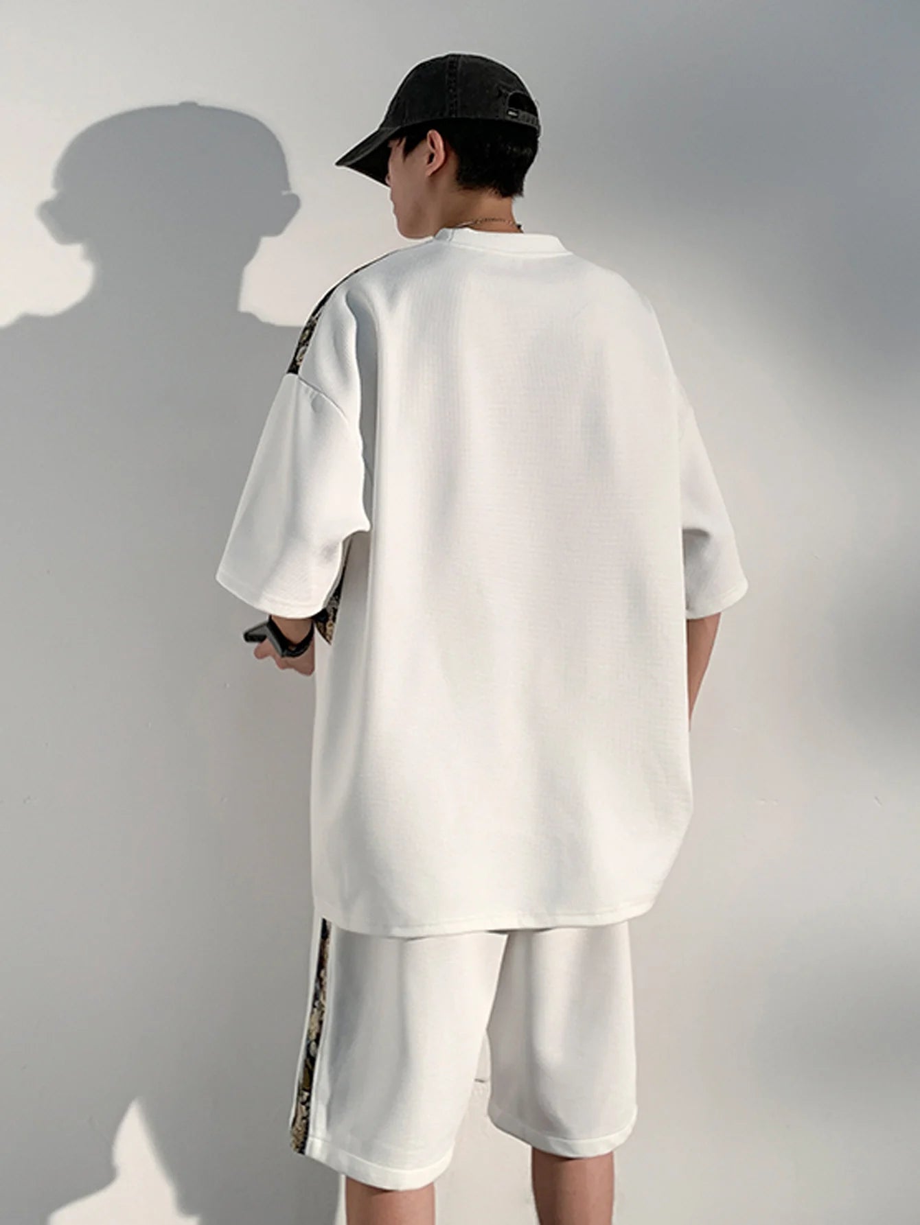 This oversized set brings a bold mix of texture and shape with contrast paneling, thick cotton-blend fabric, and stitched accents that catch the eye. From the dropped shoulders to the mid-knee shorts, every detail feels deliberate—easy to wear but never basic.