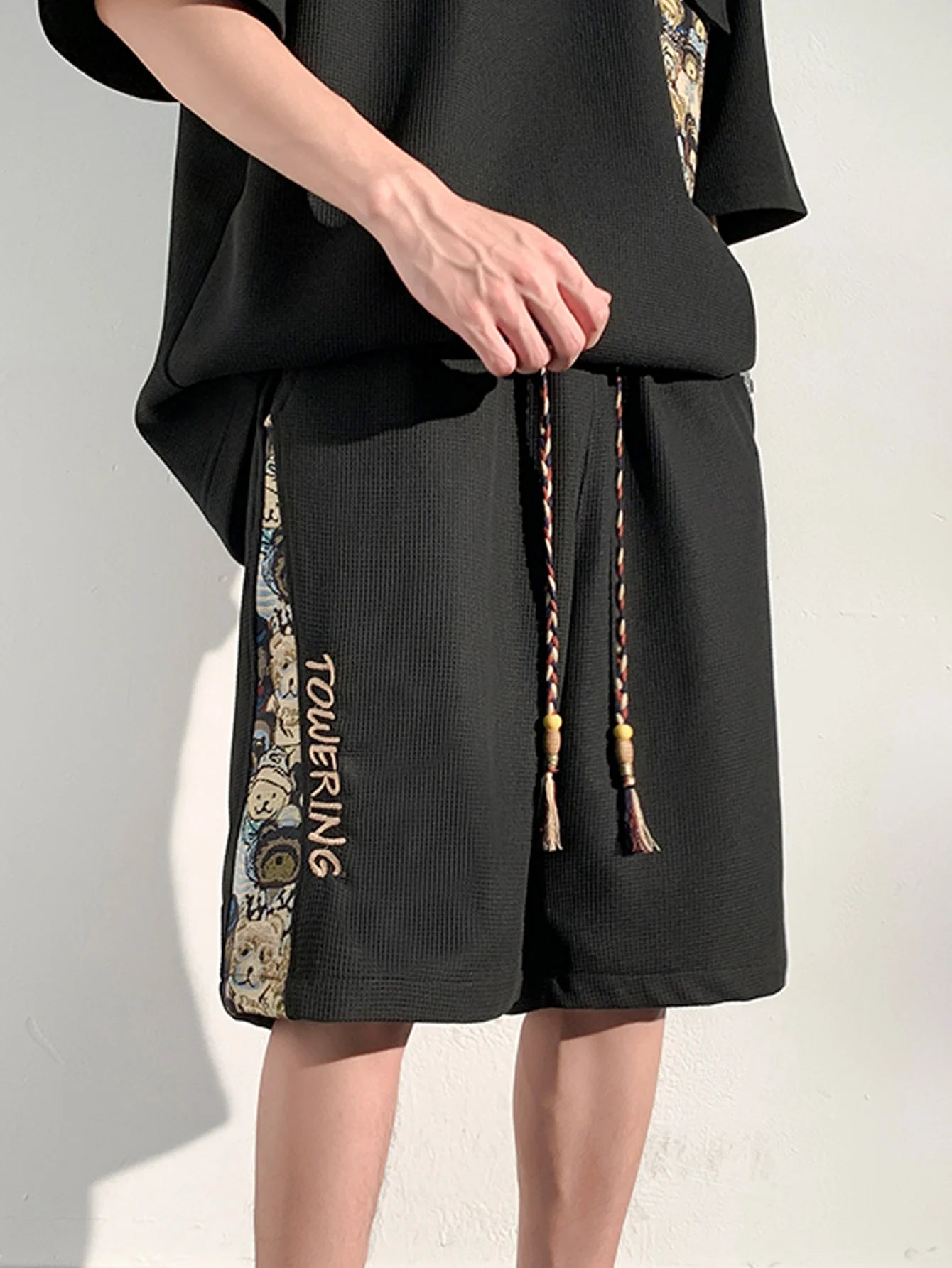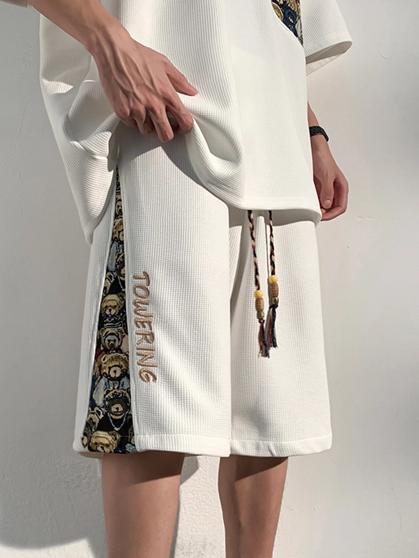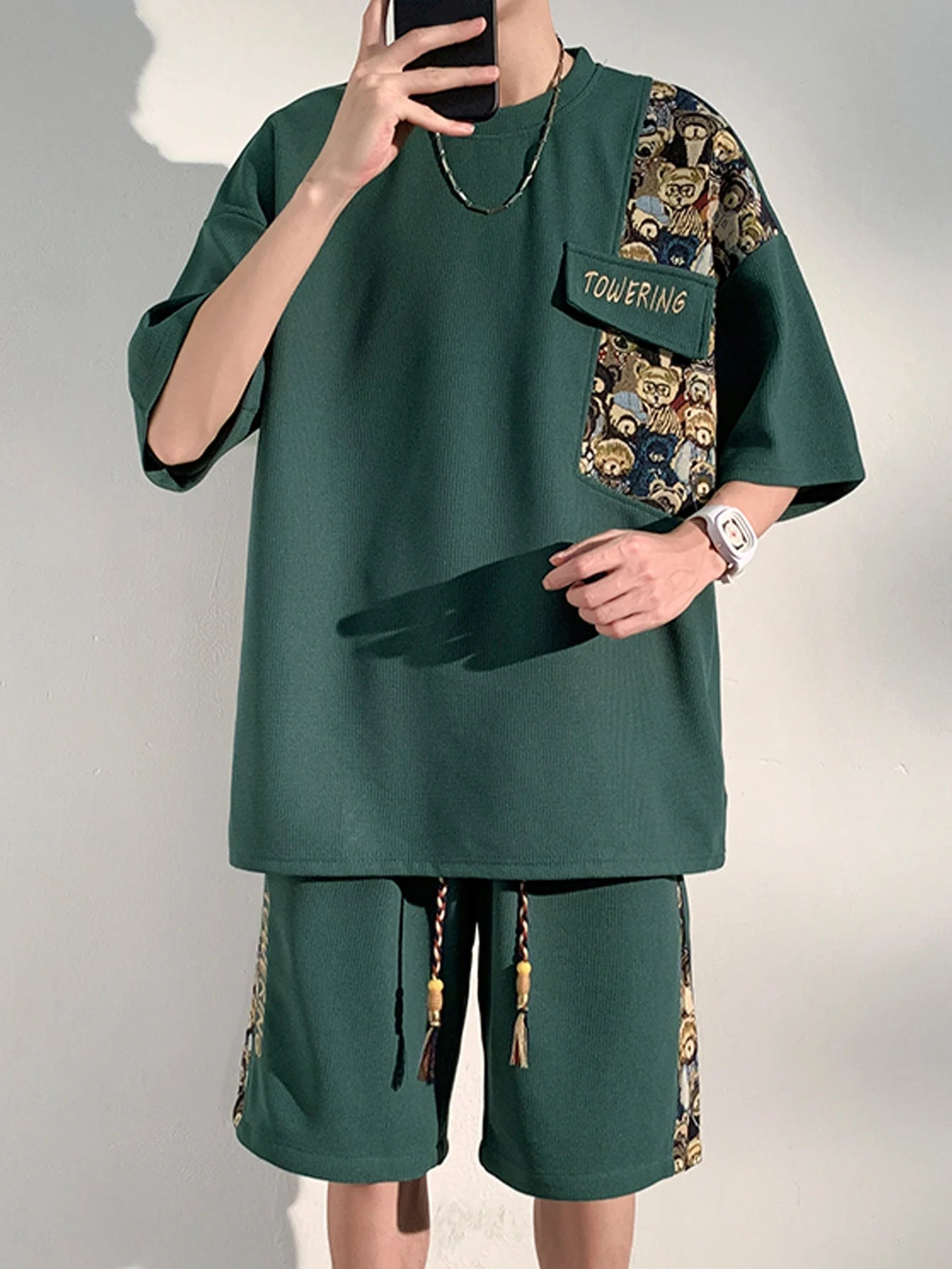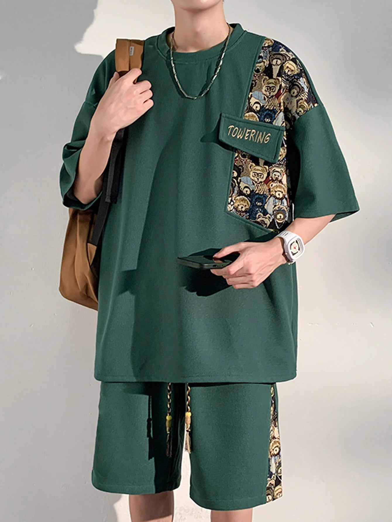 This oversized set brings a bold mix of texture and shape with contrast paneling, thick cotton-blend fabric, and stitched accents that catch the eye. From the dropped shoulders to the mid-knee shorts, every detail feels deliberate—easy to wear but never basic.