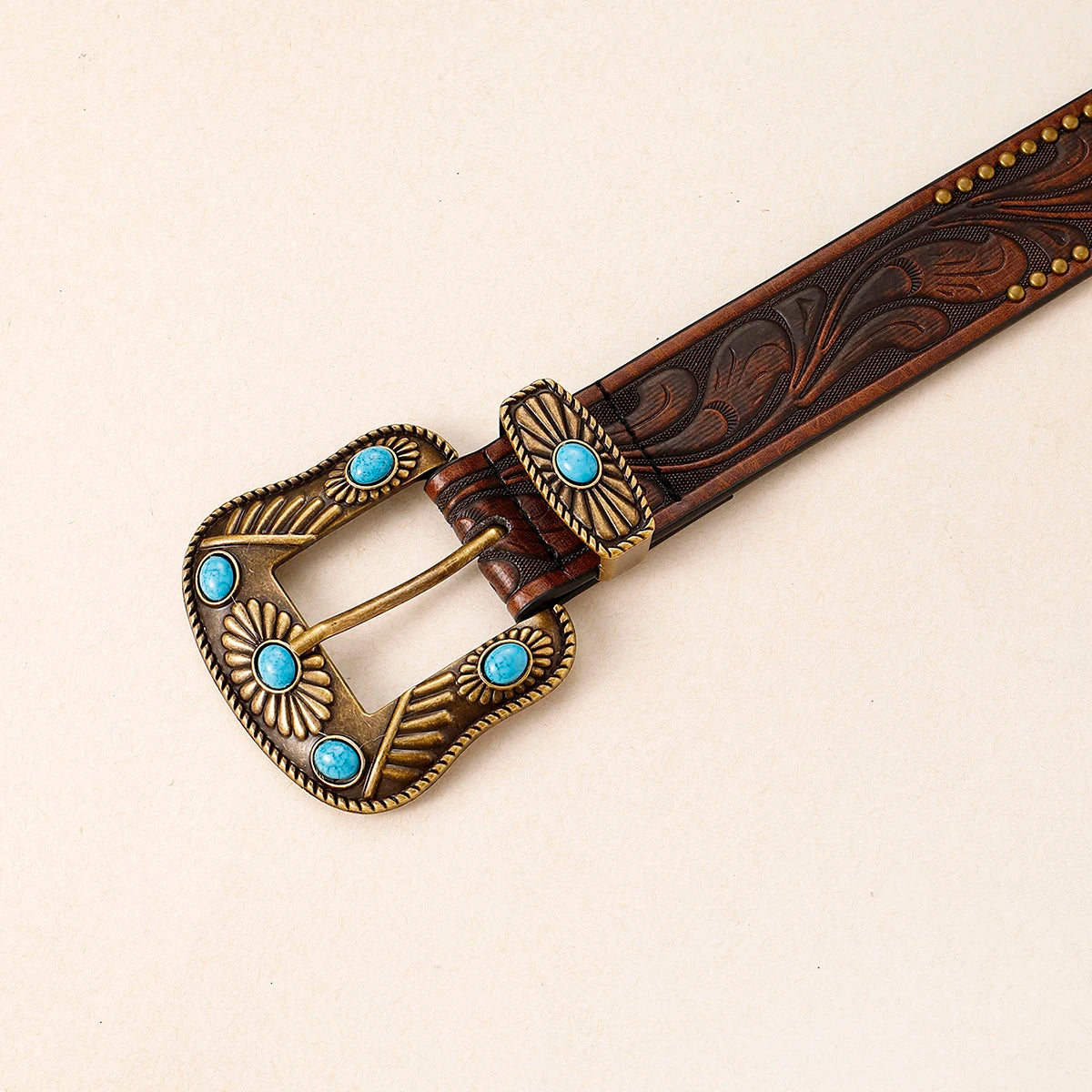 With its tooled leather texture and statement buckle, this waist-defining belt brings a touch of vintage western flair to high-rise denim, flowy dresses, or everyday layers.