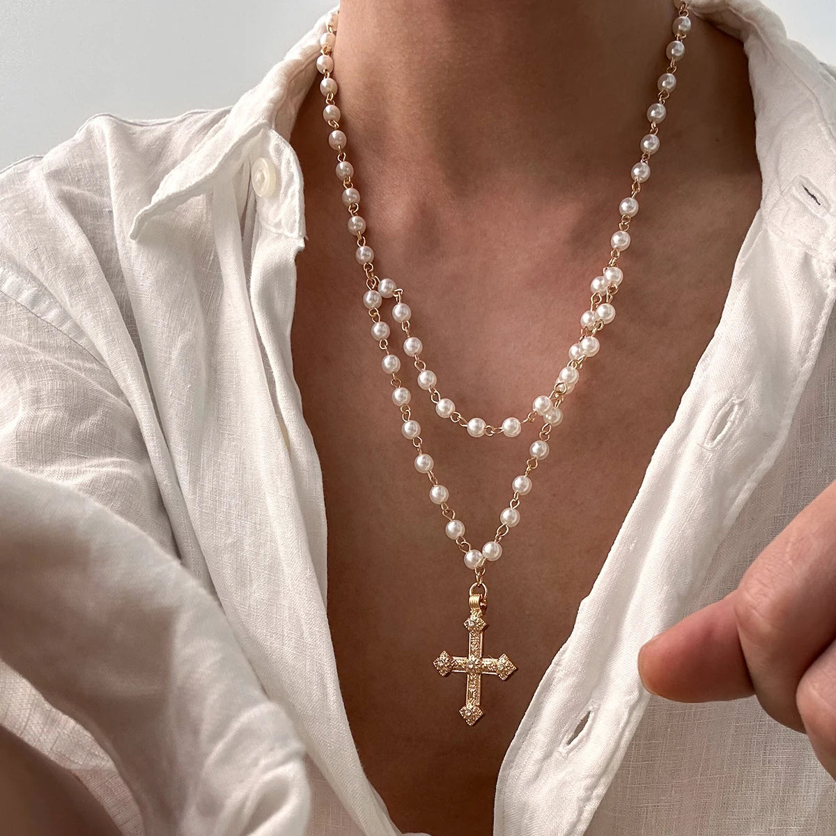 Built as one seamless piece, this layered imitation pearl necklace centers around an antique-style cross pendant and finishes with an adjustable clasp for a personal touch.